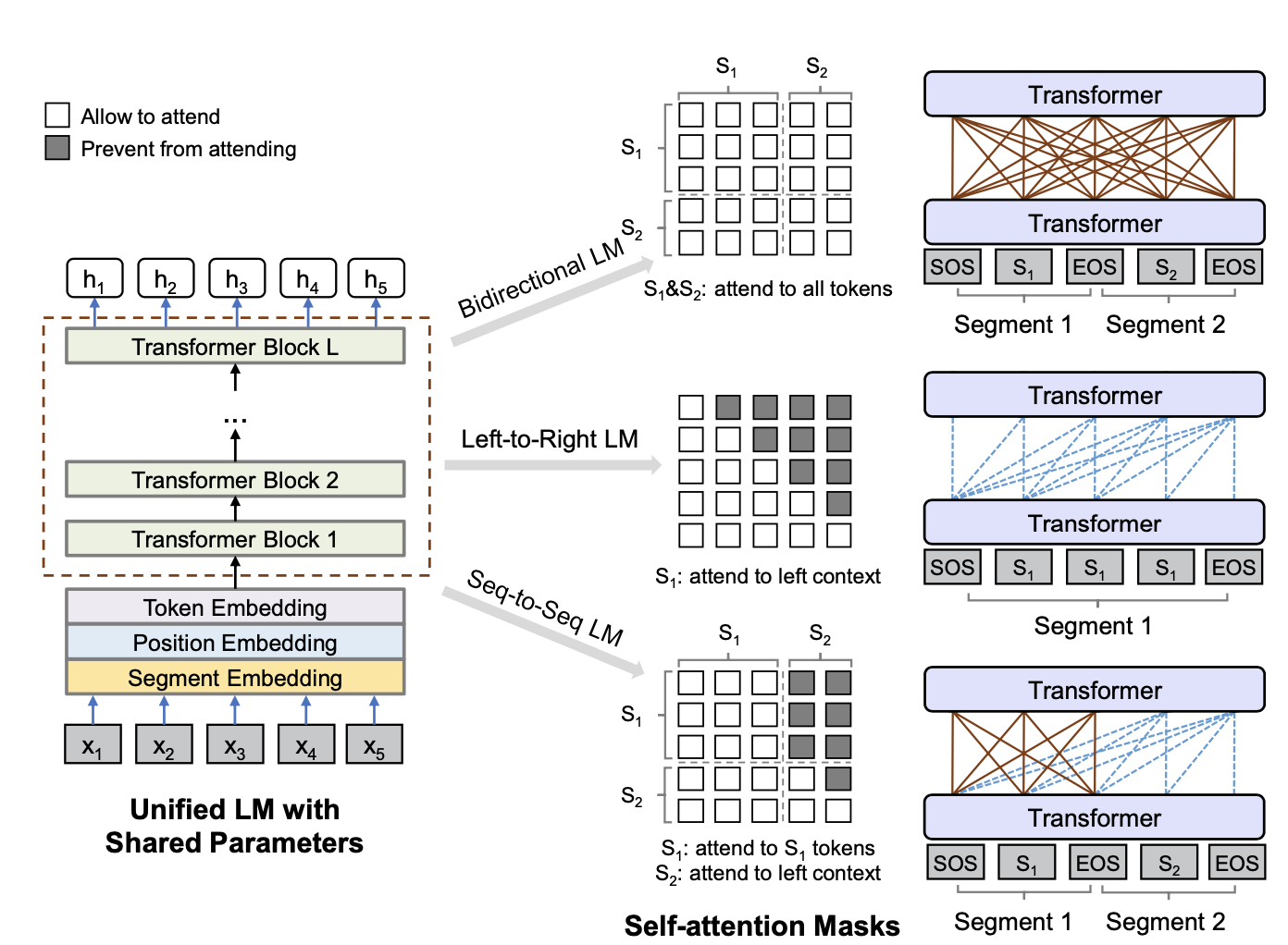 针对以上三种任务的输入略有差异,其中单向LM只有1个segment ”[SOS] s1 [EOS]“,双向LM和seq2seq LM都是2个segment “[SOS] s1 [EOS] s2 [EOS]”