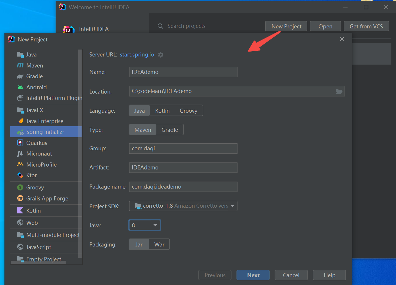 新建一个项目(如果IDEA是最新版,请在上一个项目中File->Close project 才会进入到项目管理窗口),New Project -> Spring Initializr 选项内容如图所示。