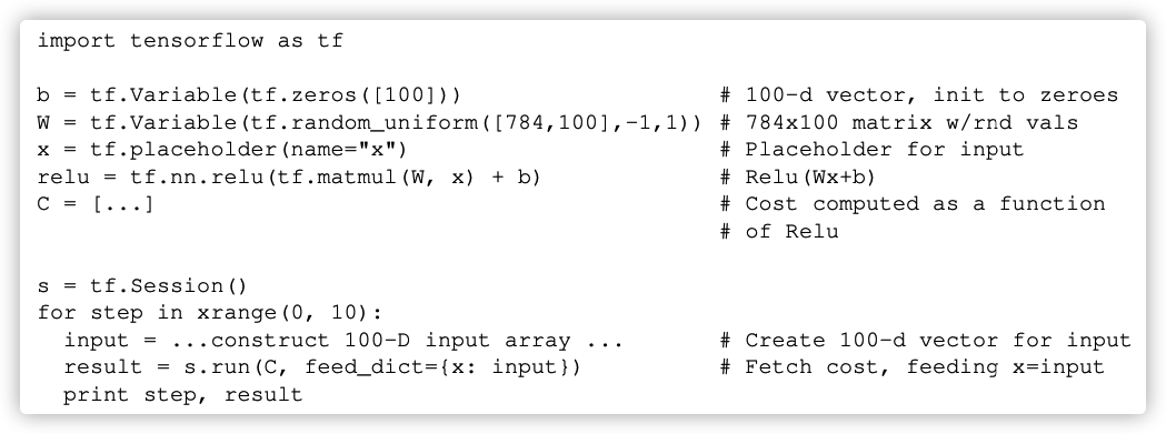 TensorFlow 计算由一组节点组成的有向图来描述。该图表示一个数据流计算,也允许让某些类型的节点来维护和更新持久状态,并以类似于 Naiad 的方式在图中实现分支和循环控制结构。客户端通常使用一种前端语言(C++或Python)构建计算图。下图显示了使用 Python 前端构建并执行 TensorFlow 计算图的示例片段,