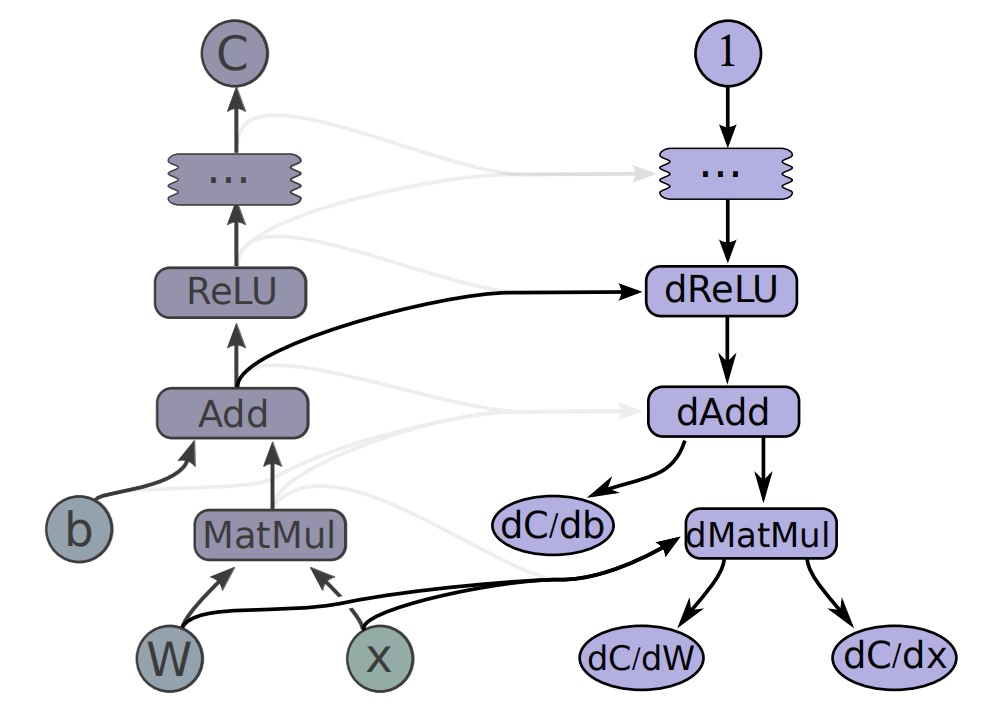 新添加的节点为前向路径中的相应操作计算"梯度函数"。梯度函数可以通过任何操作注册。该函数不仅将沿反向路径计算的部分梯度作为输入,还可以选择正向操作的输入和输出。图5显示了根据图2示例计算的成本梯度。灰色箭头显示梯度函数的潜在输入,该函数不用于所示的特定操作。