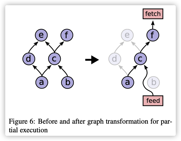 计算图可以基于输入和输出的值进行转换。输入中每个 node:port 都替换为一个 feed 节点,该节点将从用于 Run 调用的 Rendezvous 对象中获取输入张量。类似地,每个带有端口的输出名称都连接到一个特殊的 fetch 节点,该节点被用来保存输出张量,并在运行调用完成时将其返回给客户端。最后,一旦通过插入这些特殊的 feed 和 fetch 节点重写了计算图,要执行的节点集可以通过以下方式确定:从每个由输出指定的节点开始,使用图依赖关系在图中进行后向传播,以确定为了计算输出而必须在重写图中执行的完整节点集。下图在左侧显示了一个原始图,以及在使用 inputs{b} 和 outputs{f:0} 调用 Run 时生成的转换图。因为我们只需要计算节点f的输出,所以我们不会执行节点 d 和 e,因为它们与 f 的输出没有任何关系。