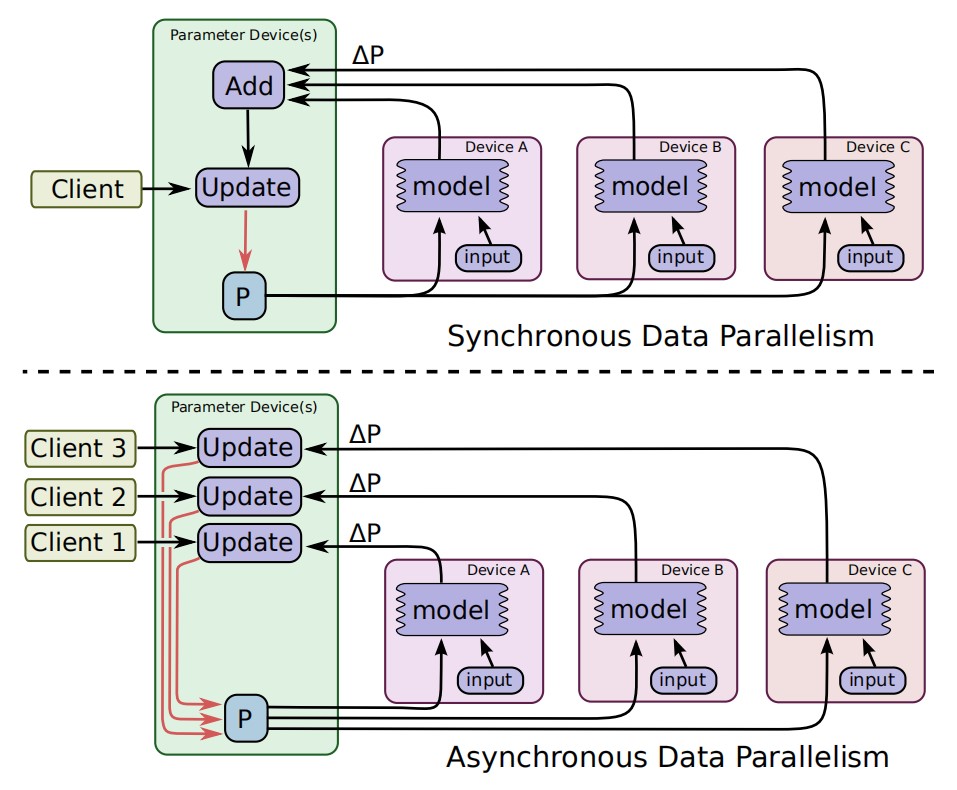 这种方法也可以是异步的,每一个模型副本异步地将梯度更新应用于模型参数,不需要彼此等待。在此配置中,每个图副本都有一个客户端线程。上图下半部分对此进行了说明。
