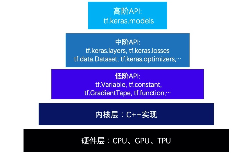 TensorFlow的层次结构从低到高可以分成如下五层:硬件层,内核层,低阶API,中阶API,高阶API。