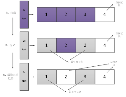 根搜索算法把垃圾回收线程把应用程序的所有引用关系看作一张图,从一个节点GC ROOT(英文解释为A garbage collection root is an object that is accessible from outside the heap,即一个可以从堆外访问的对象) 开始,寻找对应的引用节点,找到这个节点后,继续寻找这个节点的引用节点。当所有的引用节点寻找完毕后,剩余的节点则被认为是没有被引用到的节点,即无用的节点,然后对这些节点执行垃圾回收。