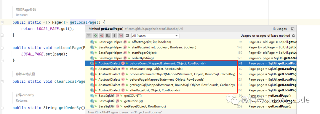 我通过代码追踪的方式定位到被调用的地方,通过回溯,发现是从这个类com.github.pagehelper.dialect.AbstractDialect发起调用的