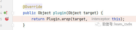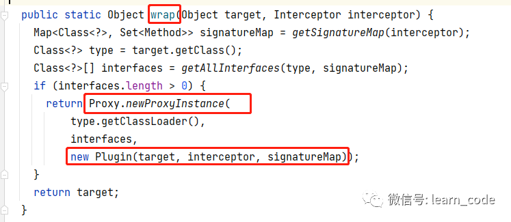 这个Plugin中有一个wrap方法会返回一个代理类,所以当调用这个代理类的方法时就会走到上面的invoke方法,就可能会进到拦截器的intercept方法。