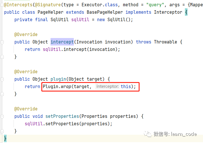PageHelper实现了Interceptor接口,它的plugin方法调用Plugin.wrap方法对目标对象进行包装,包装成一个代理对象并返回,代理类的实现就是Plugin自身。