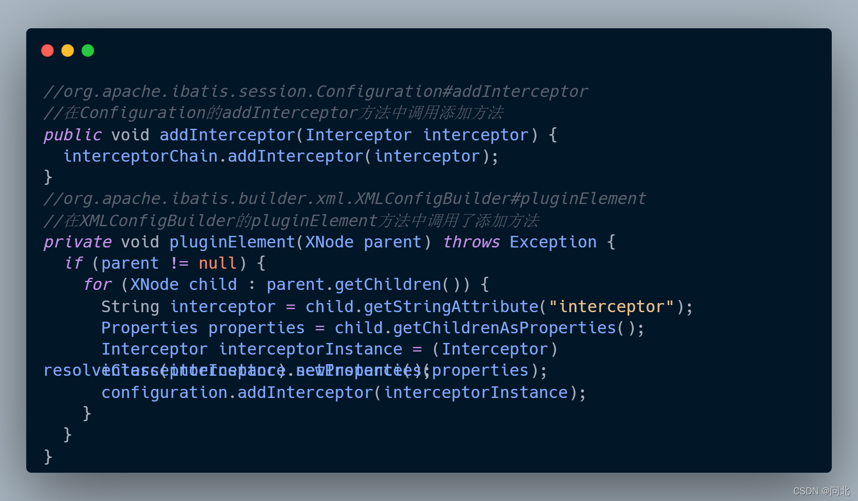 通过代码追溯,发现在Configuration的addInterceptor方法中调用添加方法,Configuration.addInterceptor是在XMLConfigBuilder的pluginElement方法中被调用