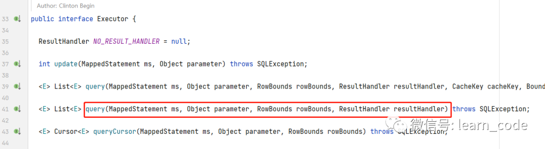 了解Mybatis的插件机制的就明白了,这一行配置的意思是拦截Executor中的query方法,方法参数列表类型是MappedStatement.class, Object.class, RowBounds.class, ResultHandler.class,就是下面这个方法。