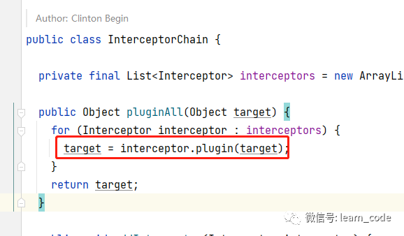 该类有一个List保存所有拦截器,还有三个方法,分别是pluginAll用于调用所有拦截器的plugin方法,addInterceptor添加拦截器,getInterceptors获取拦截器链。