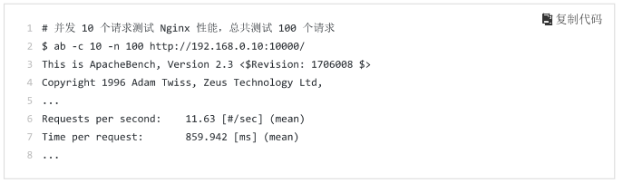 从ab输出结果可以看到,Nginx能承受的每秒平均请求数只有11.63。为了方便分析,我们将请求数增到10000,继续压测
