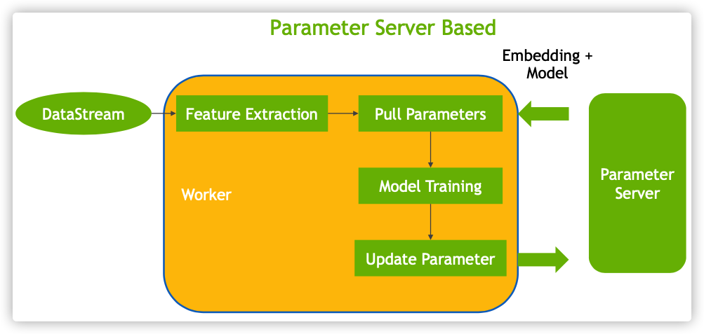 HugeCTR 实现的是一个基于GPU的参数服务器,其将embedding层放到GPU之中,worker通过与参数服务器的交互来获取embedding。