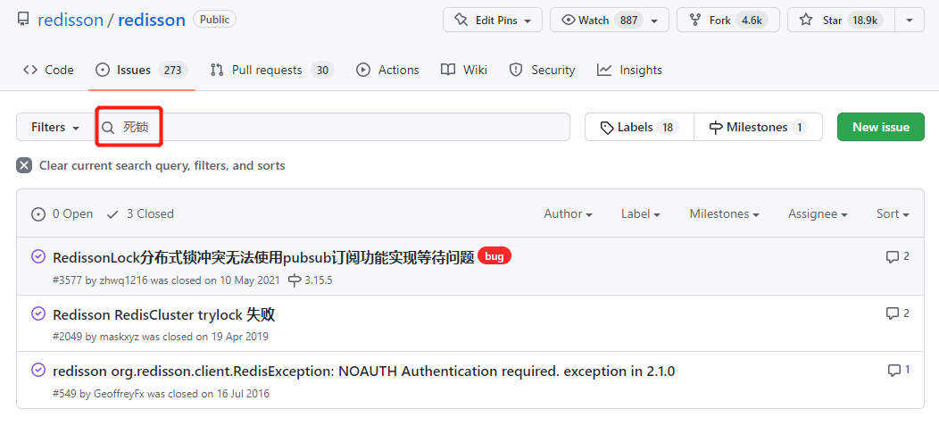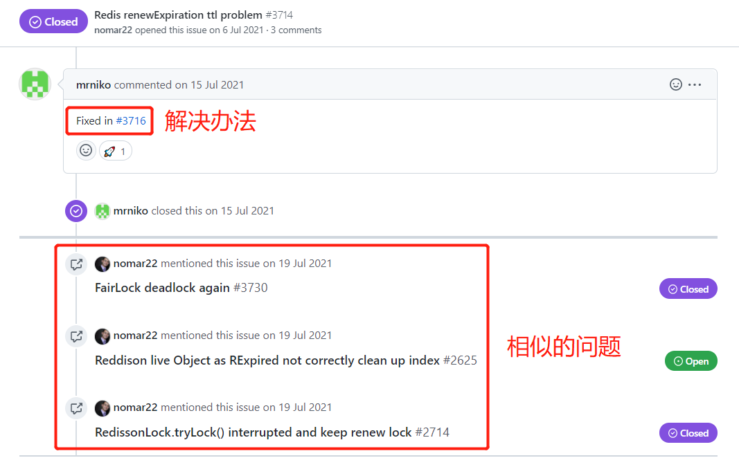 比如,上面的截图中,最后一个叫 Deadlock after Redis timeout 的 issue,就是我想要找的东西: