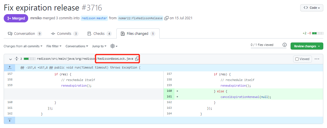 而且我也能知道这次提交对应的类叫做 RedissonBaseLock.java: