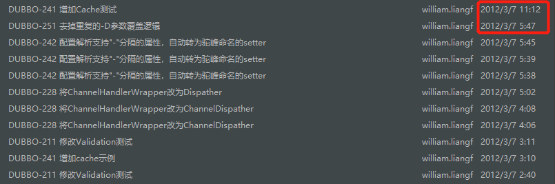 点击 Version Control 视图里面的 Log 标签,就可以看到整个项目历史上的所有的提交,它会按照时间的顺序给你排好序,所有很容易就找到了当天的相关的提交: