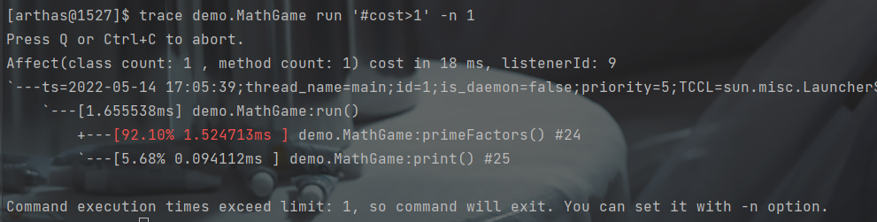 从上图中可以看到,primeFactors的方法耗时最长,如果想深入primeFactors方法,可以打开一个新的终端,使用telnet localhost 3658 连接上arthas,在trace primeFactors时指定listenerId。