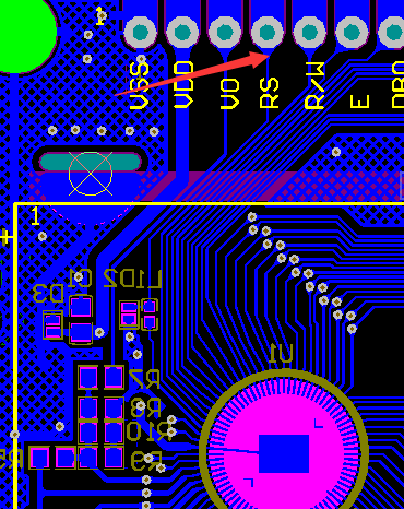 通过对实验现象的分析,判断是显示屏本身出现了抗干扰不过的情况。查看其PCB LAYOUT图,如下图: