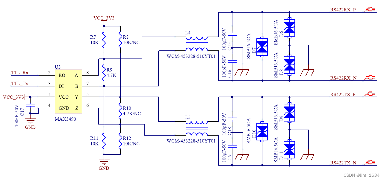 从上述可知,RS232不是差分信号,只需TVS管、磁珠和330p电容就可完成EMC的电路设计;RS485和RS422的EMC电路设计是一样的,都是由一样参数的共模电感、TVS管和100p电容完成设计的。以上设计主要是按照GJB 151B和DO 160G的标准进行设计的,对于不同行业或者标准可对此电路进行调整元器件参数或者增加元器件(如防雷器件)。