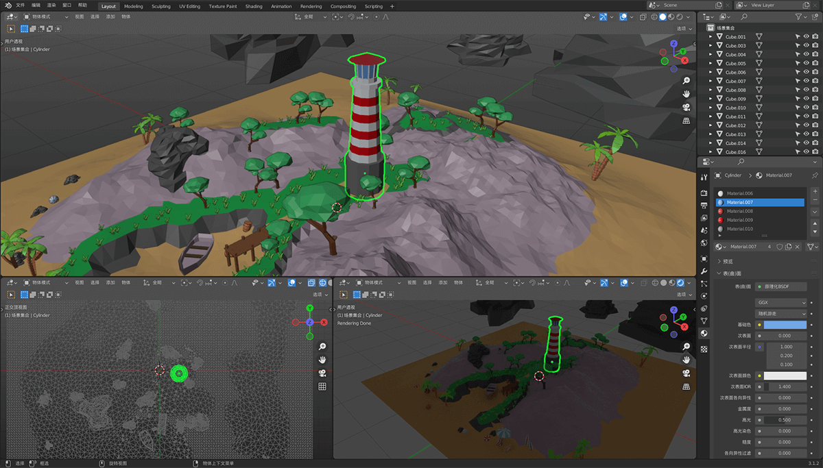 开发之前,需要准备页面所需的素材,本文用到的海岛素材是在 sketchfab.com 找的免费模型。下载好素材之后,在 Blender 中打开,按自己的想法调整模型的颜色、材质、大小比例、角度、位置等信息,删减不需要的模块、缩减面数以压缩模型体积,最后删除相机、光照、UV、动画等多余信息,只导出模型网格备用。