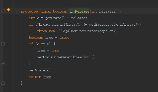 其实很简单,就是判断锁的状态,也就是加了几次锁,然后减去释放的,最后判断释放之后,锁的状态是不是0(因为可能线程加了多次锁,所以得判断一下),是的话说明当前这个锁已经释放完了,然后将占有锁的线程设置为null,然后返回true,