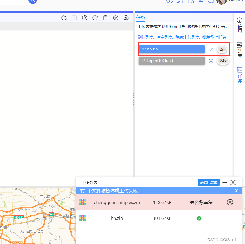 将压缩好的矢量边界数据拖拽至上传框或者直接点击选择压缩包,点击上传;看到以下界面表示上传成功,我们也可以在资源栏中看到它。