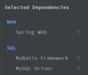 第一步,新建一个名为druid-sql的SpringBoot项目,选择spring web、mybatis framework和mysql driver依赖: