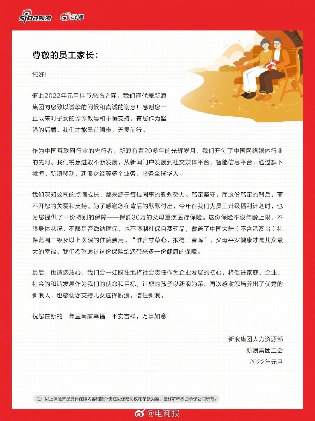 12月中旬,新浪集团以全员邮件的方式正式公布了一项员工福利细则:“不限年龄、不限地域、不限社保自费药品及有无社保、不限健康状况和病史、覆盖中国大陆(不含港澳台)社保范围二级及以上医院的住院费用、为员工父母配备保额30万元的重疾医疗保险。”