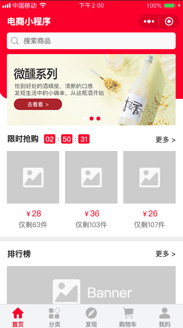首页功能主要分为四个部分,搜索、Banner图、限时抢购和推荐商品列表,点击搜索框会跳转到搜索页,推荐部分是分页展示的,用户通过不断地往上滑动可以加载下一页。通过分析首页我们大致需要提供三个接口,分别是Banner接口,限时抢购接口和推荐接口。