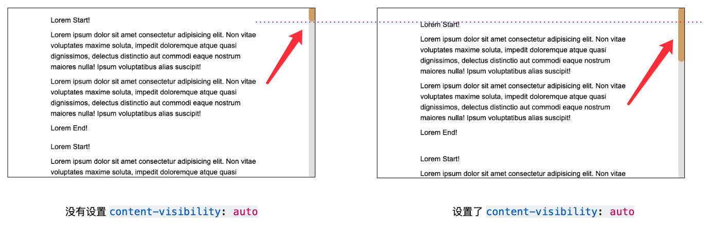从上面的例子,也能看到,在利用 content-visibility: auto 处理长文本、长列表的时候。在滚动页面的过程中,滚动条一直在抖动,这不是一个很好的体验。