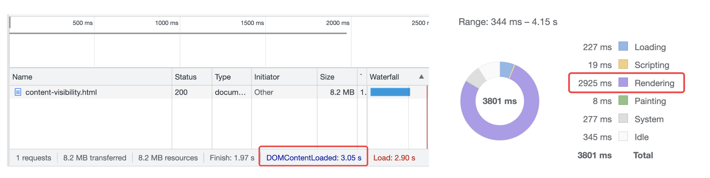 可以看到,DOMContentLoaded 的时间的 3s+,而花费在 Rendering 上的就有整整 2900ms!