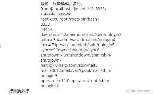 - sed -r '/root/d' passwd 删除带有root的行