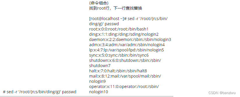 - sed -r 's/^root/aofo/' passwd 把以root 开头的行root替换成aofo