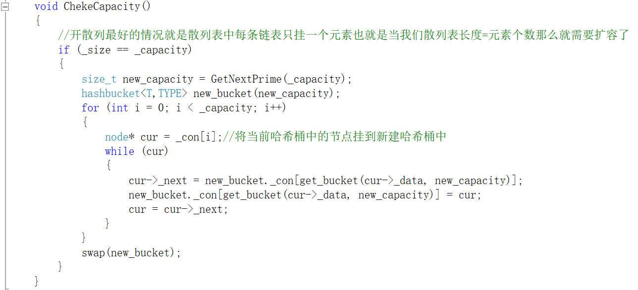 - node* cur = _con[i];//将当前哈希桶中的节点挂到新建哈希桶中