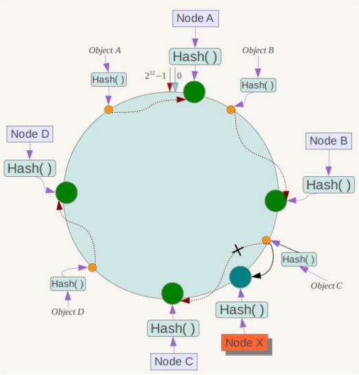 在一致性哈希算法中,如果一个节点挂了,受影响的数据仅仅是此节点到环空间前一个节点(沿着逆时针方向行走遇到的第一个节点)之间的数据,其它不受影响。增加一个节点也同理。