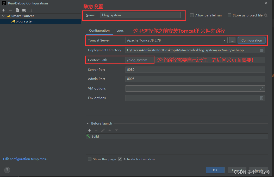 5)在这个smart tomcat 设置界面,需要设置的有三个,name 可以随意设置,自己顺眼就行;Tomcat Server 刚开始是没有的,需要选择自己安装 tomcat 的路径的文件夹;第三个 Context Path 很重要,设置后一定得记住,当然记不住也没关系,之后可以再打开这个界面看看。