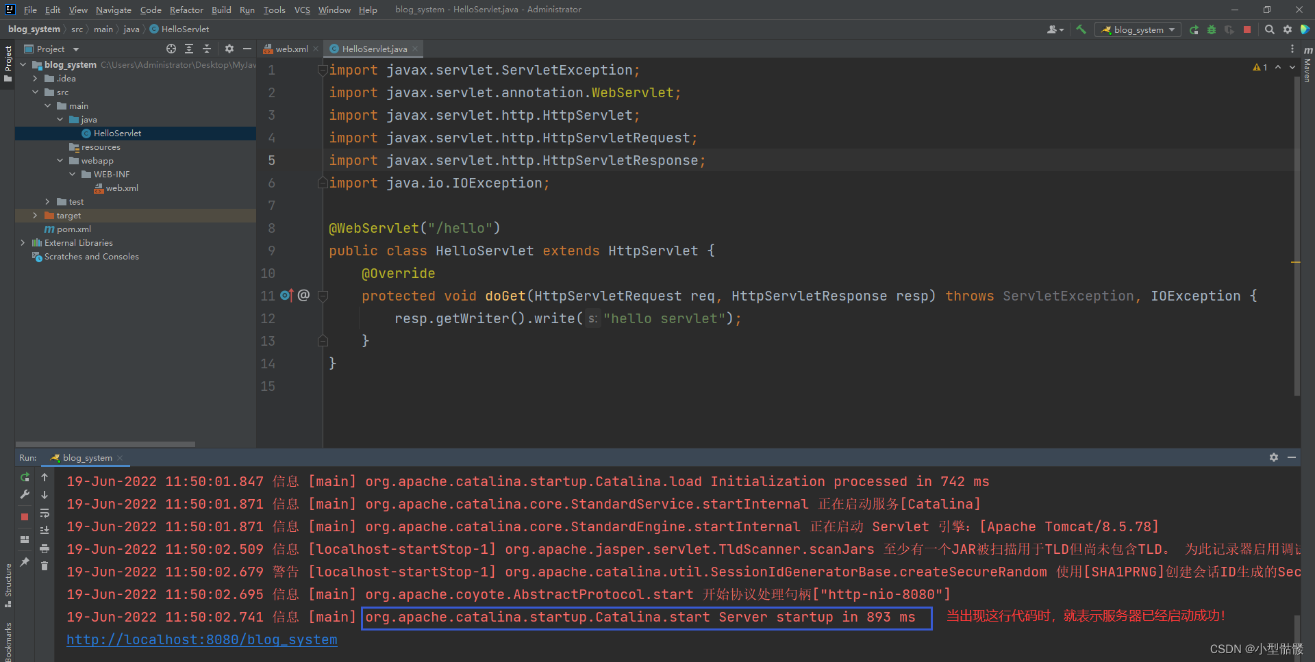 1)在浏览器输入这串地址:127.0.0.1:8080/blog_system/hello ,注意,第一个斜杠和第二个斜杠之间的是我们之前在smart tomcat 里设置的 context path ,第二个斜杠后面的是 HelloServlet上面设置的 servlet path ,当页面出现 “hello servlet” 时,就说明前置准备已经完毕了: