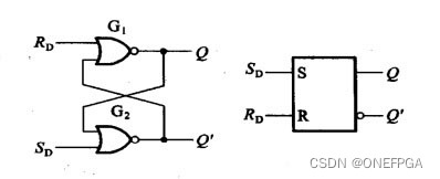 从电路结构中可以看出,它是由两个交叉反馈或非门组成的。它有两个输入端,SD表示置位,RD表示复位,输入端为1时表示有激励信号,为0时表示无激励信号;有两个输出端,Q是输出,正常工作时,Q’是Q的反变量。