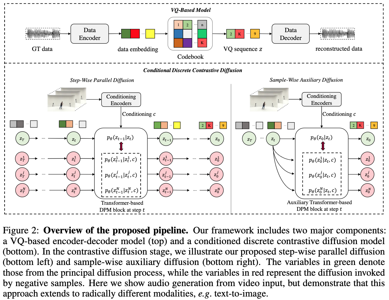扩散概率模型 (DPMs) 已成为一种流行的条件生成方法,因为它们具有可喜的结果和对跨模态合成的支持。条件合成中的一个关键要求是在条件输入和生成的输出之间实现高度对应。大多数现有方法通过将先验结合到变分下限中来隐式地学习这种关系。在这项工作中,我们采取了不同的路线 - 我们通过使用对比学习最大化它们的互信息来增强输入-输出连接。为此,我们引入了条件离散对比扩散(CDCD)损失,并设计了两种对比扩散机制,以有效地将其纳入去噪过程。我们通过将 CDCD 与传统的变分目标联系起来来制定 CDCD。我们展示了我们的方法在评估三种不同的多模态条件合成任务中的有效性:舞蹈到音乐生成、文本到图像合成和类条件图像合成。在每一个方面,我们都实现了最先进或更高的合成质量,并改善了输入-输出的对应关系。此外,所提出的方法提高了扩散模型的收敛性,在两个基准上将所需的扩散步骤数量减少了 35% 以上,显着提高了推理速度。