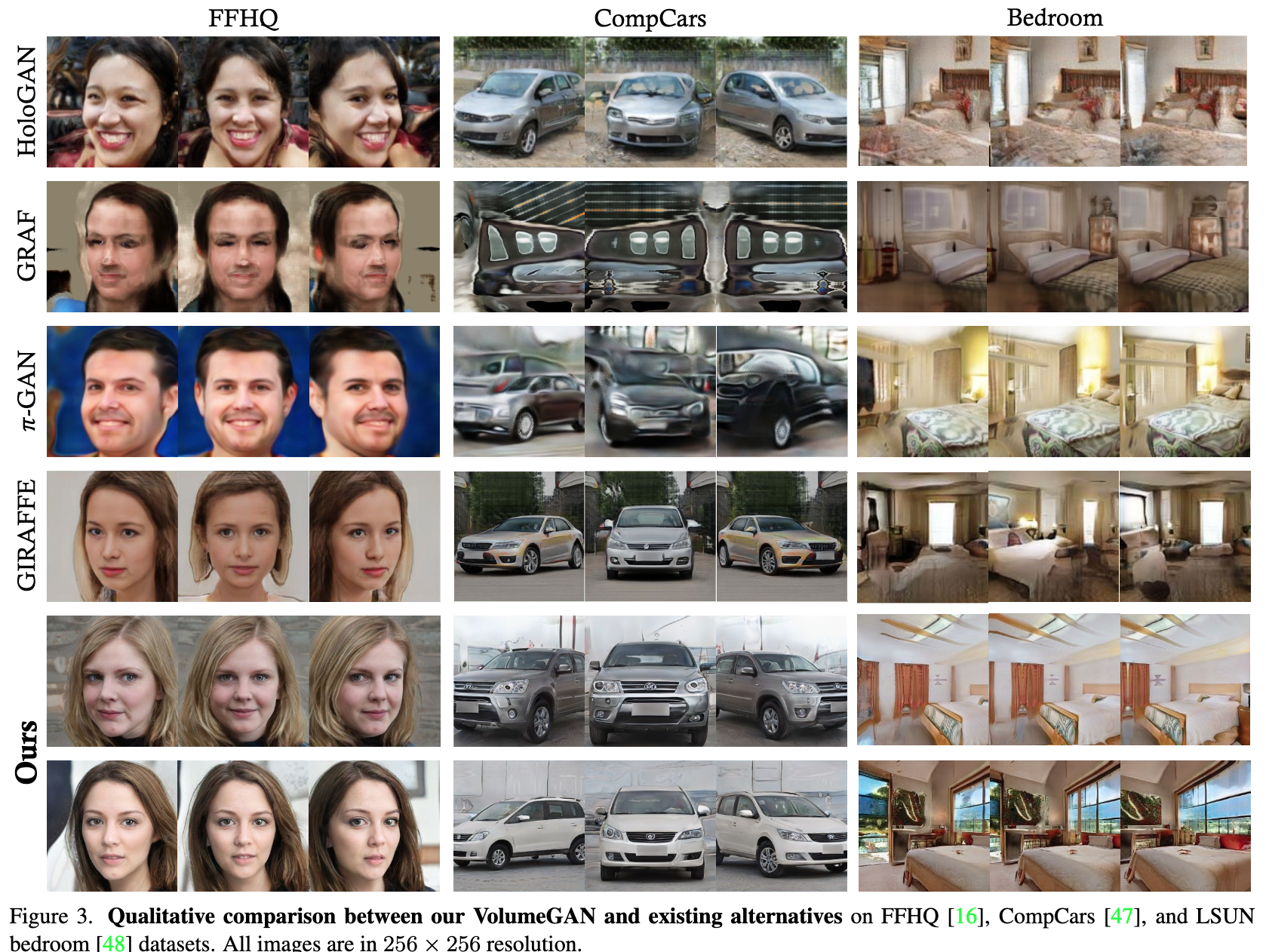 论文摘要:Making generative models 3D-aware bridges the 2D image space and the 3D physical world yet remains challenging. Recent attempts equip a Generative Adversarial Network (GAN) with a Neural Radiance Field (NeRF), which maps 3D coordinates to pixel values, as a 3D prior. However, the implicit function in NeRF has a very local receptive field, making the generator hard to become aware of the global structure. Meanwhile, NeRF is built on volume rendering which can be too costly to produce high-resolution results, increasing the optimization difficulty. To alleviate these two problems, we propose a novel framework, termed as VolumeGAN, for high-fidelity 3D-aware image synthesis, through explicitly learning a structural representation and a textural representation. We first learn a feature volume to represent the underlying structure, which is then converted to a feature field using a NeRF-like model. The feature field is further accumulated into a 2D feature map as the textural representation, followed by a neural renderer for appearance synthesis. Such a design enables independent control of the shape and the appearance. Extensive experiments on a wide range of datasets show that our approach achieves sufficiently higher image quality and better 3D control than the previous methods.