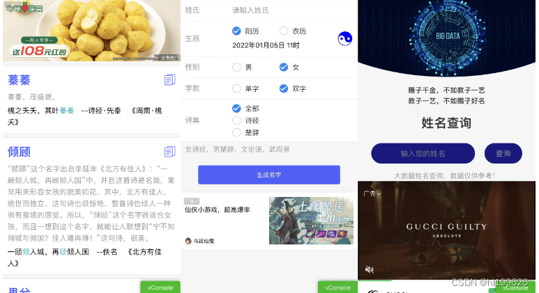 名字来源查询 取名工具(支持多种选择取名) 查询重复名(输入名字查询有多少人和你吃饭) 诗文(里面就是一些古诗啥的展示)