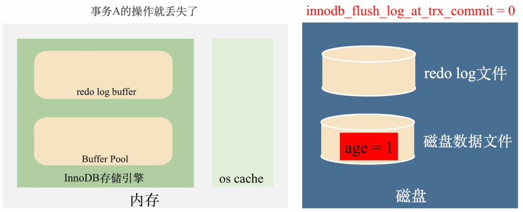 还是上面的那个例子,如果三个事务执行完毕,在age = 4还没有刷到磁盘的时候,突然断电,数据就全部丢掉了: