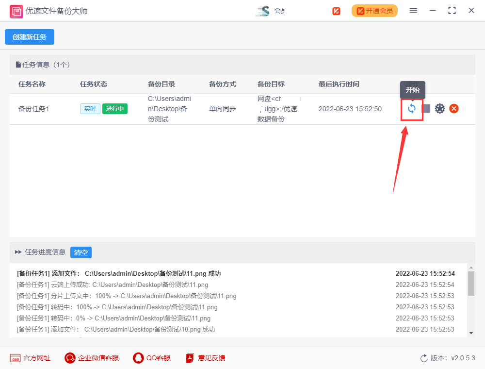第五步,点击备份任务右边的“开始”图标,启动备份,之后只要软件不关闭,软件就会将备份目录中的文件实时备份到百度网盘了,不再需要手动执行。