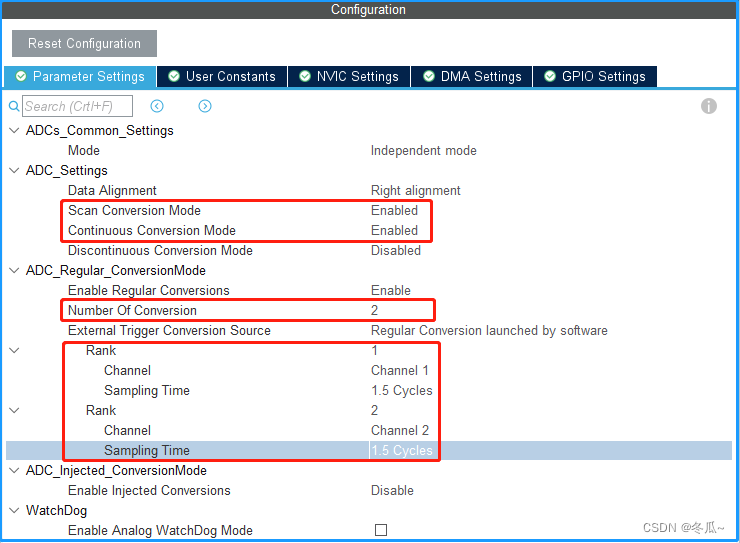 Scan Conversion Mode 扫描模式 。Continuous Conversion Mode 连续转换模式 。Rank,给IN1、IN2选择合适的采样通道和采样周期。