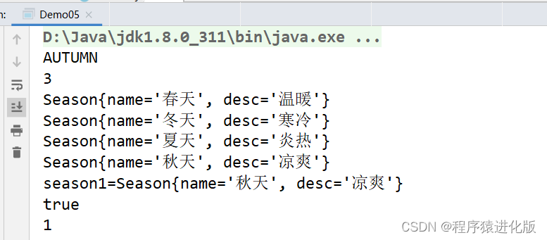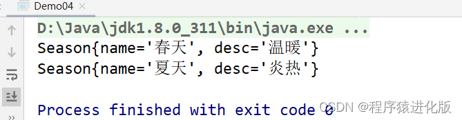 - SPRING("春天", "温暖"),WINTER("夏天", "炎热"),SUMMER("夏天", "炎热"),AUTUMN("秋天", "凉爽");