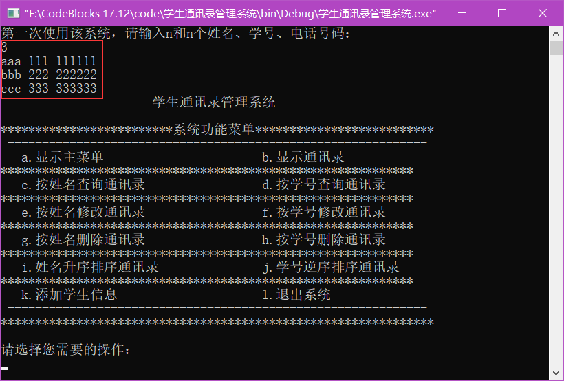 printf("第一次使用该系统,请输入n和n个姓名、学号、电话号码: