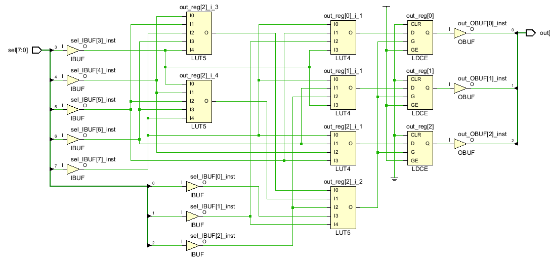综合出来的电路结构如下,和料想的一致,组合逻辑LUT+锁存器LATCH。