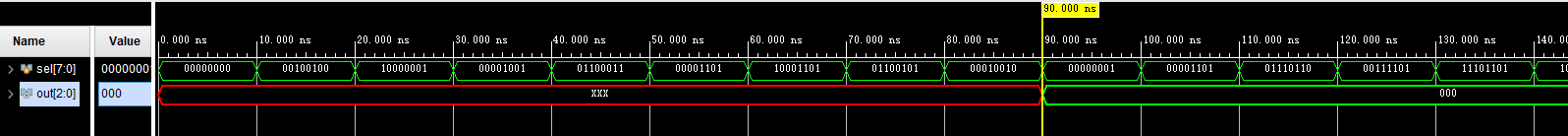 由于之前sel值均不是独热码值,所以输出out无法被编码,又没有使用default语句,所以此时的输出均为x。直到第一个独热码00000001出现,输出开始编码到000。后面又不符合独热码规则,无法编码,所以输出值一直保持之前的值不变,成为了事实上的锁存器。