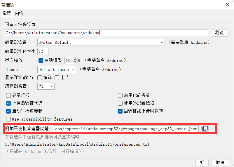 添加方式:文件->首选项->附加开发板管理器网址中加入Arduino core for esp32的地址: