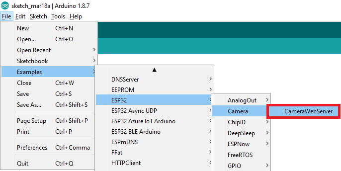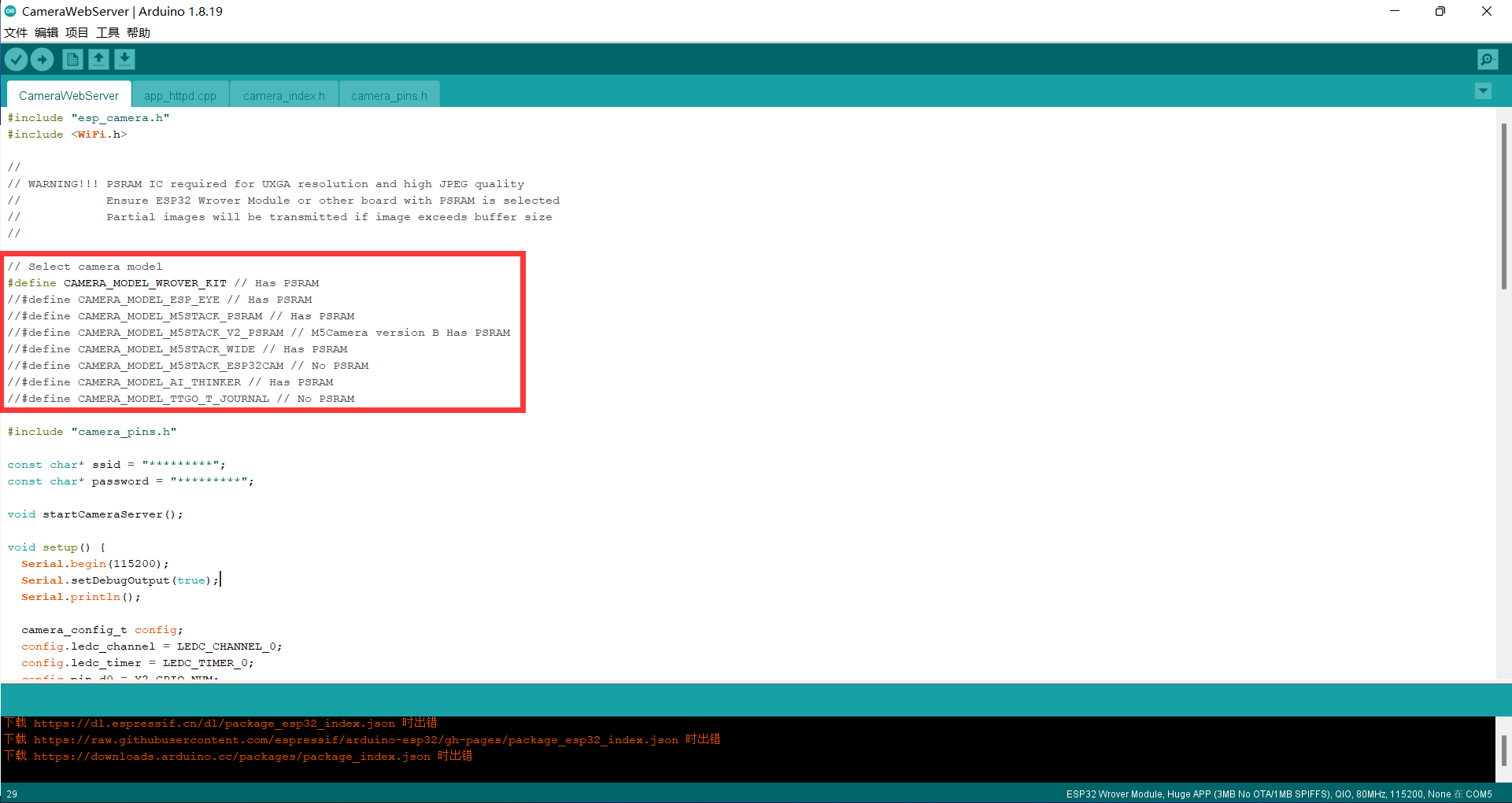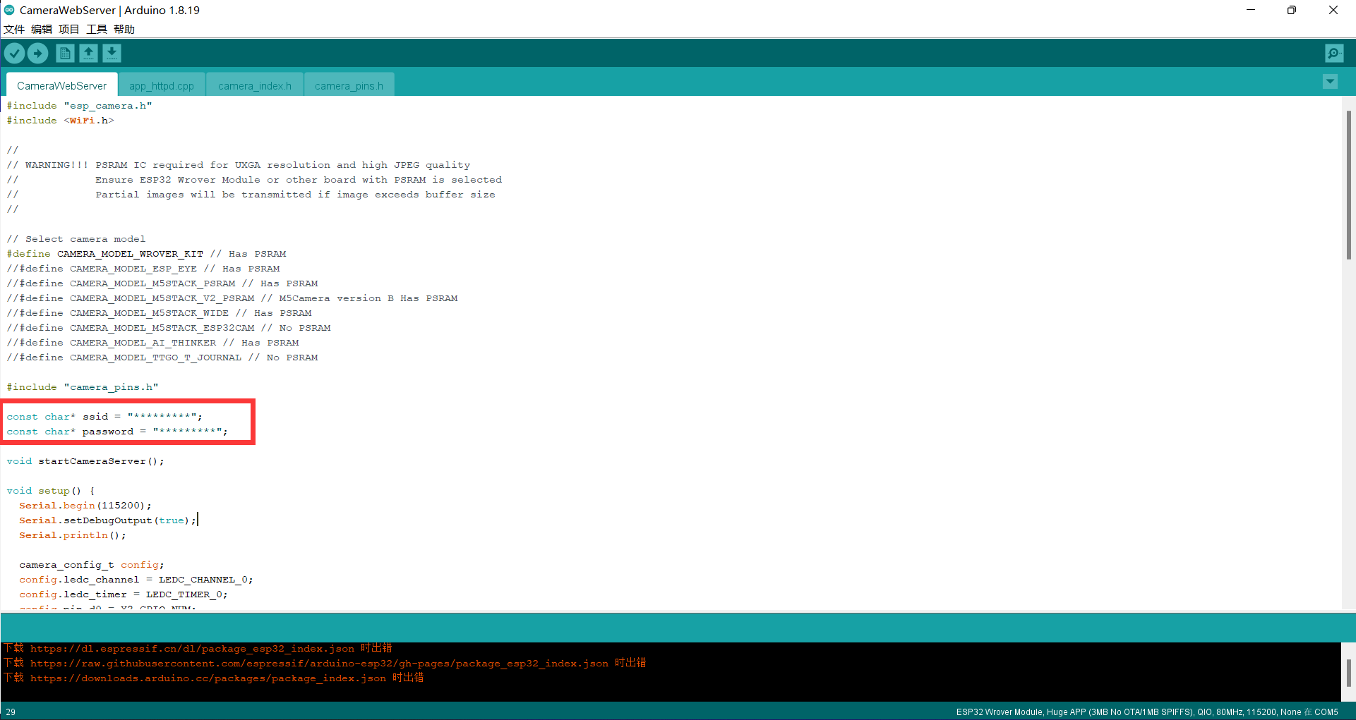 下载后,解压缩该文件夹,然后打开CameraWebServer.ino文件。