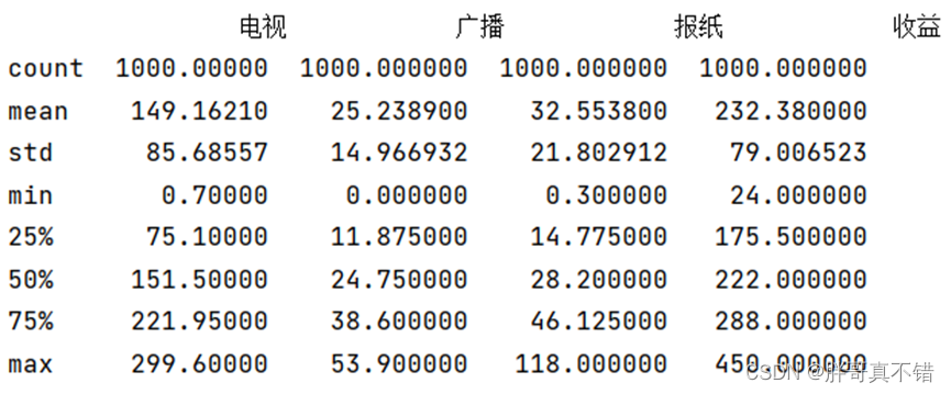 通过Pandas工具的describe()方法来查看数据的平均值、标准差、最小值、分位数、最大值。